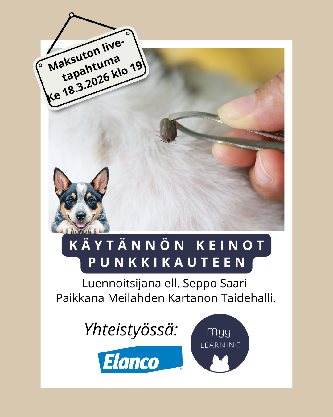 Keskiviikkona 18.3. astut sisään Meilahden kartanon Taidehallin henkeäsalpaavaan miljööseen, ja luvassa on jotain historiallista: ensimmäinen laatuaan oleva punkkiluennon supertapahtuma, jossa ääneen pääsee yksi eläinlääketieteen kirkkaimmista nimistä – eläinlääkäri ja tarttuvien eläintautien erikoiseläinlääkäri Seppo Saari.